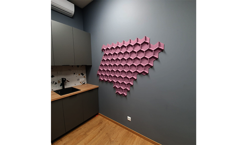 Panourile din plută Honeycomb ajută la absorbția sunetului și reduc ecoul din cameră. Nu doar că arată ca un fagure — însăși structura plutei seamănă cu unul. Este formată din milioane de celule mici pline cu aer, care absorb eficient zgomotul.